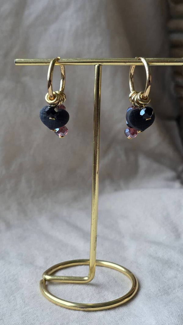 Handmade black heart with 18 k gold plated hoops